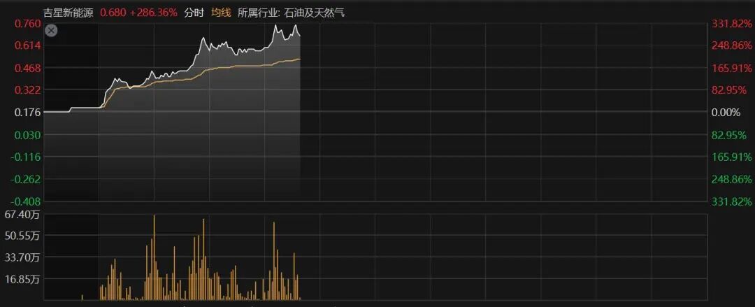 截至发稿,吉星新能源飙升逾290%,创近4年新高,并且涨幅还在进一步扩大中,开盘不到10分钟成交就超过昨日(17日)全天成交。联合能源集团、百勤油服等也大涨超20%。