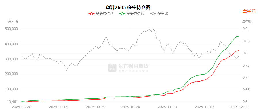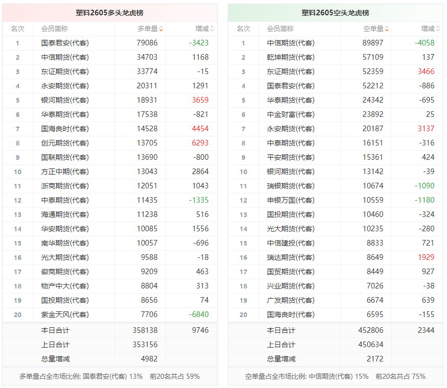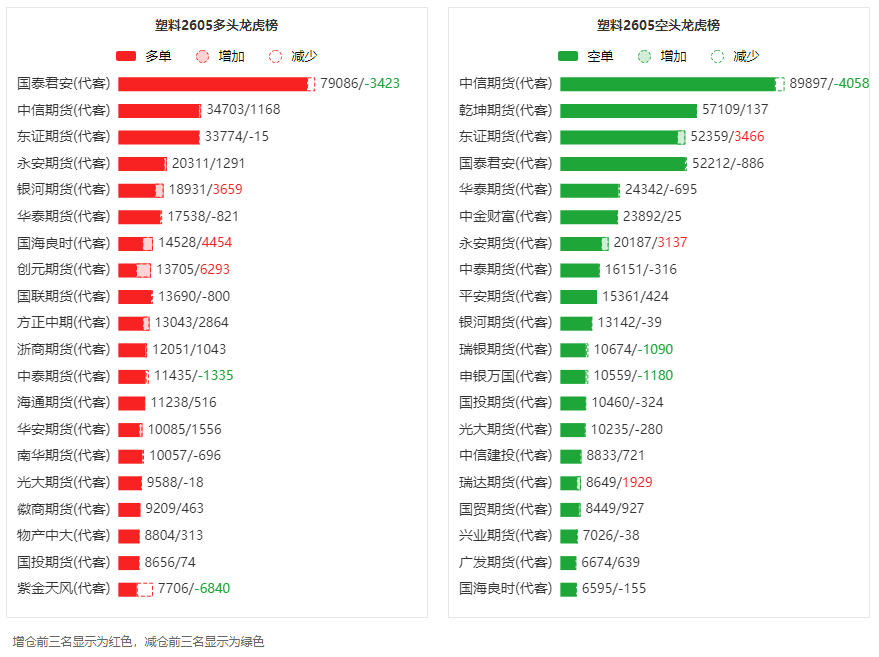 总体而言,塑料2605合约今日增仓下行,多空持仓排名前20席中,多空双方均呈进场态势,多头进场意愿强于空头。