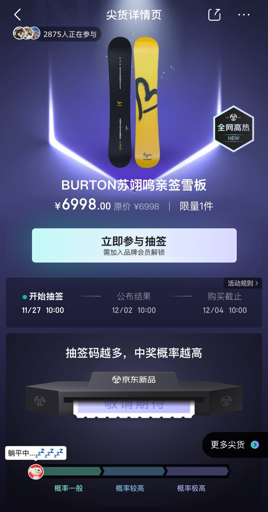 11月29日,在2025-2026赛季国际雪联大跳台世界杯云顶站单板滑雪男子决赛中,中国选手苏翊鸣获得冠军。作为本届国际雪联三项世界杯的官方赞助商,京东运动现场见证这一荣耀时刻,发售BURTON x 苏翊鸣联名雪板,并独家开启苏翊鸣亲签款雪板的抽签预约。